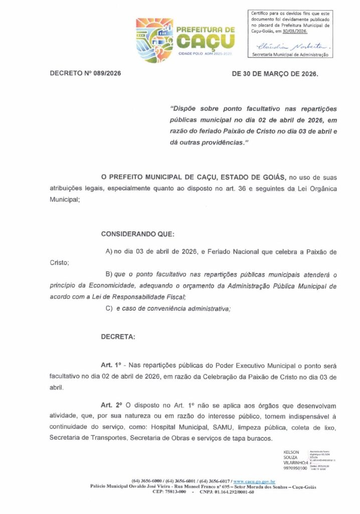 De acordo com Decreto Municipal nº089/2026, o Prefeito Municipal de Caçu, Estado de Goiás, no uso de suas atribuições legais, dispõe sobre ponto facultativo nas repartições públicas municipal no dia 02 de abril de 2026, em razão do feriado Paixão de Cristo no dia 03 de abril e dá outras providências.